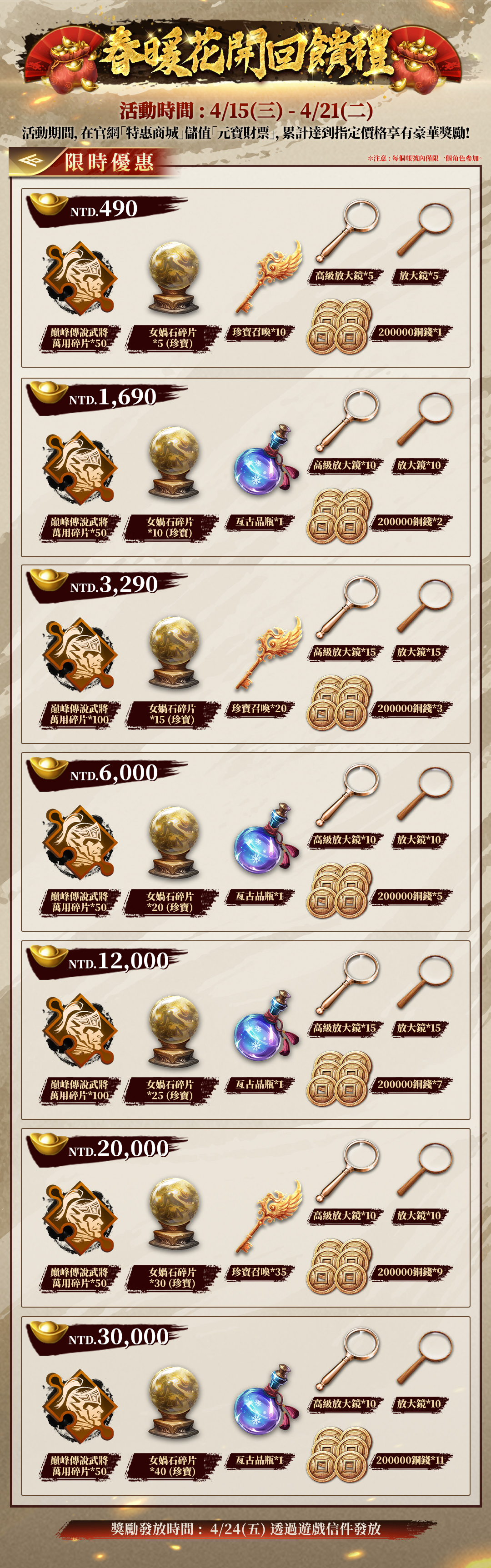 4/24(五)19:00前,透過遊戲內信件發送